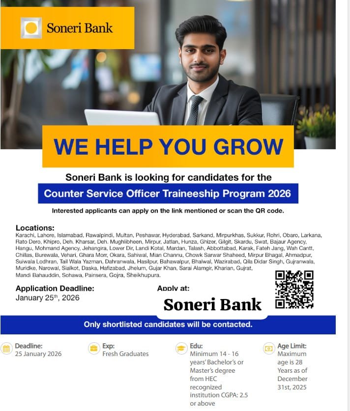 Don’t miss this chance to join Soneri Bank Limited’s banking team. If you’re a fresh graduate aged 18-28 with a Bachelor’s degree, apply now for the Soneri Bank Counter Service Officer 2026 program and begin your journey toward a rewarding banking career.